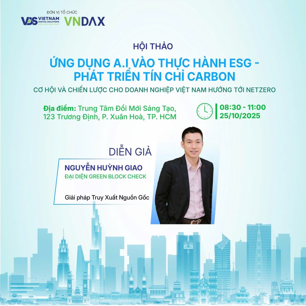 Ngày 25/10/2025, tại Trung Tâm Đổi Mới Sáng Tạo – 123 Trương Định, Quận 3, TP.HCM, hội thảo “Ứng dụng A.I vào thực hành ESG – Phát triển tín chỉ carbon” do VDS Vietnam Digital Solutions và VNDAX tổ chức đã diễn ra sôi nổi, quy tụ nhiều chuyên gia, doanh nghiệp và nhà quản lý cùng thảo luận về hướng đi bền vững cho doanh nghiệp Việt Nam trong hành trình hướng tới Net Zero 2050.